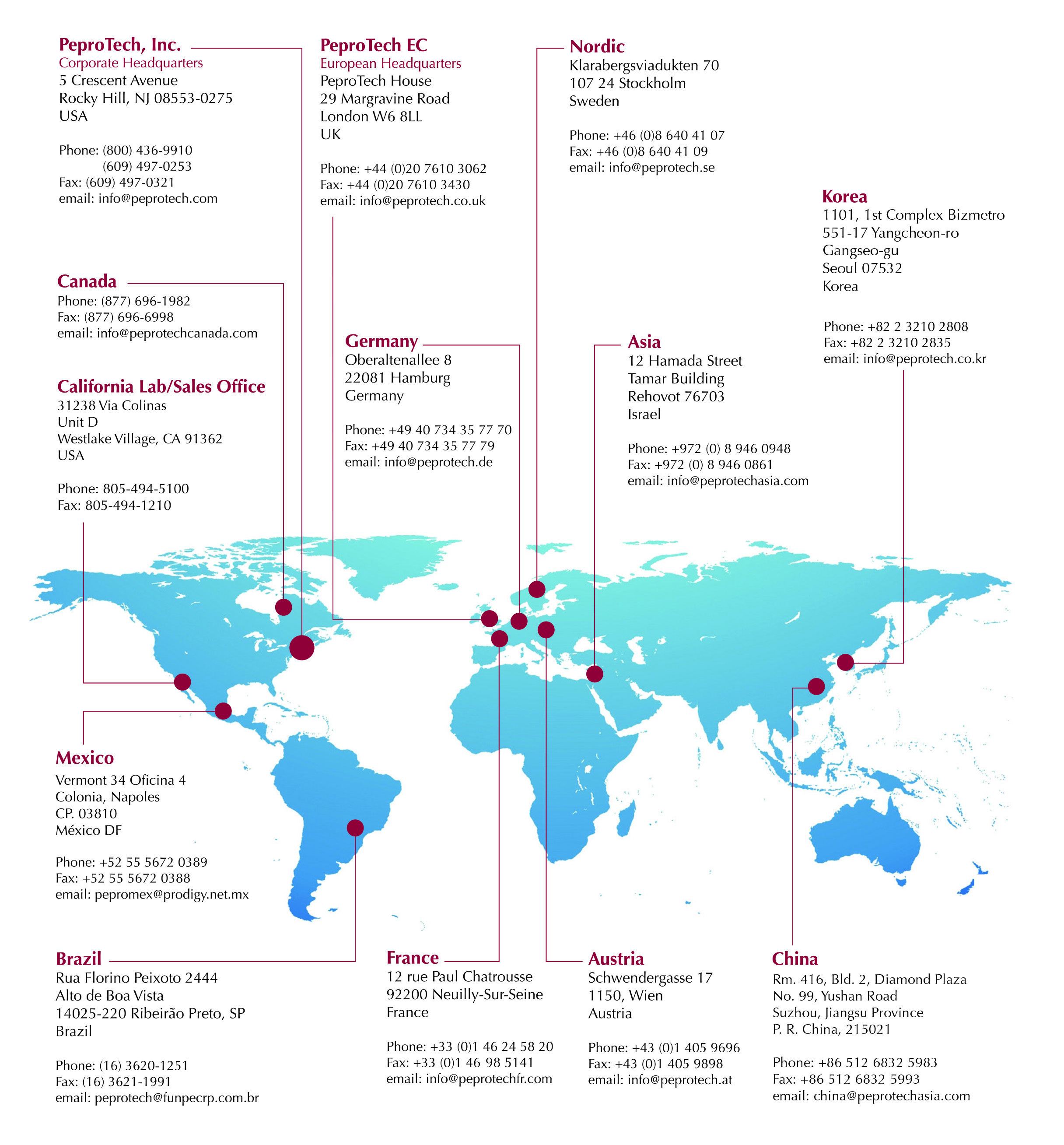 PeproTech 公司創(chuàng)立于1988年,總部位于美國新澤西州。 PeproTech 公司始 終致力于為生命科學(xué)研究和細(xì)胞治療市場提供高品質(zhì)的細(xì)胞因子產(chǎn)品。在過 去的27年 里,PeproTech在推動這些領(lǐng)域的發(fā)展中一直扮演著重要角色。美 國總部的先進(jìn)生產(chǎn)設(shè)施和遍布十余個國家的客戶服務(wù)網(wǎng)絡(luò),使得PeproTech 公司成為科研工作者可以信賴的合作伙伴。同時,來自科研院所和工業(yè)界的 研究人員為我們產(chǎn)品線的不斷擴充提供了寶貴的意見和創(chuàng)意源泉。PeproTech 公司運用創(chuàng)新方法開發(fā)出 2000 余種高品質(zhì)、高穩(wěn)定性和重復(fù)性的 產(chǎn)品,包括大腸桿菌、昆蟲細(xì)胞和哺乳動物細(xì)胞來源的重組細(xì)胞因子/蛋白 、相關(guān)單克隆/多克隆抗體、ELISA試劑盒、無血清細(xì)胞培養(yǎng)基以及其他細(xì)胞 因子相關(guān)試劑。欲了解 PeproTech 全套產(chǎn)品線、獲取產(chǎn)品詳情和參考文獻(xiàn)等,請訪問其官網(wǎng):www.peprotech.com。