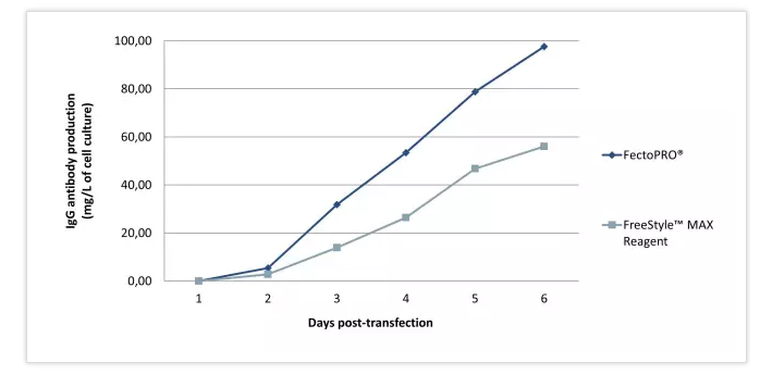 圖1. FectoPRO?大幅提高懸浮CHO細(xì)胞的抗體產(chǎn)量。按1×106個(gè)細(xì)胞/ml的密度將細(xì)胞培育在30ml的無血清培養(yǎng)基中,并依照每種試劑說明書推薦用量FectoPRO?(0.8 μg DNA/ml)或FreeStyle?MAX試劑(1.25 μg DNA/ml)進(jìn)行轉(zhuǎn)染。用蛋白質(zhì)G生物感應(yīng)器(fortéBIO? octet RED96 system)對重組小鼠IgG的產(chǎn)量監(jiān)測1~6天?!狿roteoGenix SAS(法國)提供的數(shù)據(jù)。