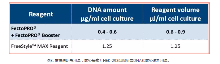 圖2. FectoPRO?大幅提高懸浮CHO和HEK-293細(xì)胞的蛋白產(chǎn)量。按1×106個(gè)細(xì)胞/ml的密度將FreeStyle? CHO-S和HEK-293F細(xì)胞培育在30 ml的無血清培養(yǎng)基中,并依照每種試劑說明書推薦用量FectoPRO?+FectoPRO?輔助藥劑Booster (0.4 μg DNA/ml)、FreeStyle?MAX試劑(1.25 μg DNA/ml)或PEIpro?(1 μg DNA/ml)進(jìn)行轉(zhuǎn)染。用蛋白質(zhì)G親和性定量法(HPLC)和Western Blot檢測轉(zhuǎn)染后72小時(shí)(CHO細(xì)胞)和120小時(shí)(HEK-293細(xì)胞)的IgG3-Fc (34 kDa)的產(chǎn)量。