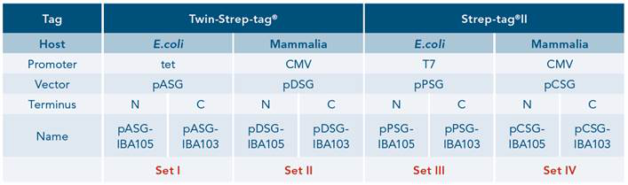 SetⅠ與SetⅡ?yàn)門win-Strep-tag?(三代純化標(biāo)簽),SetSetStrep-tag?II(二代純化系統(tǒng))標(biāo)簽。每組載體包含兩個(gè)1μg帶Amp抗性的載體,分別為TagN-TermC-Term的載體
