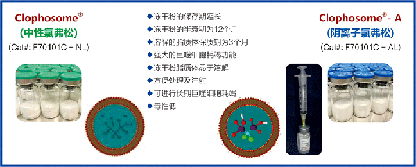 為了延長脂質(zhì)體的保質(zhì)期,廠家已成功推出凍干粉狀的Clophosome?產(chǎn)品,其質(zhì)保期已延長至12個月。通過簡單的溶解,即可成功獲得氯磷酸鹽脂質(zhì)體。同樣,凍干粉狀的Clophosome?保持了與液態(tài)Clophosome?同樣杰出的巨噬細胞耗竭功能,以及活性高,使用方便,無菌無毒,以及高濃度,高包封率,不粘稠,無沉淀,易于注射等諸多優(yōu)越性能,尤其是凍干粉狀的Clophosome?克服了脂質(zhì)體保質(zhì)期短,穩(wěn)定性差的缺陷。