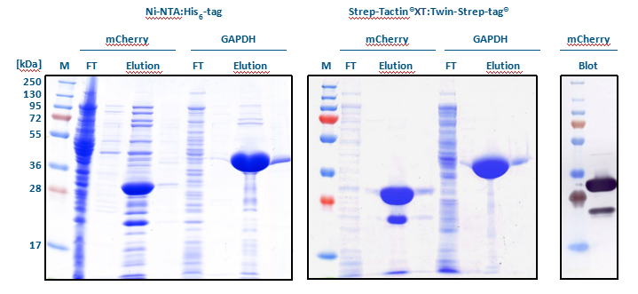 以SDS-PAGE分析發(fā)現(xiàn),不管是mCherry或是GAPDH,使用Strep-tactin? XT: Twin-Strep-tag?都能得到純度較高的目標蛋白(見Elution)。Western Blot分析結果顯示,提取mCherry所出現(xiàn)的雜質為其降解產物。