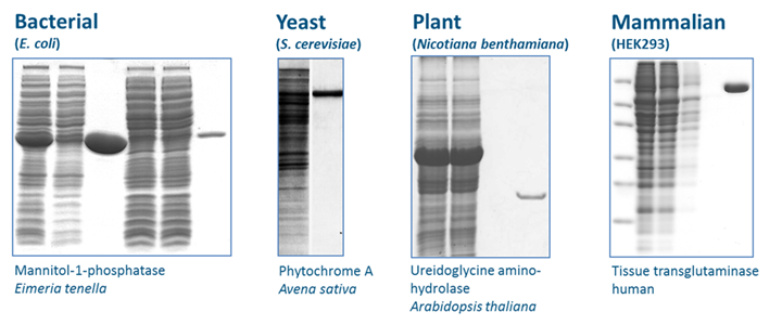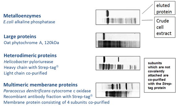 因His-tag系統(tǒng)使用Ni離子,所以在純化金屬蛋白(多數(shù)為酶)時,可能會受到金屬間交互作用的干擾。而使用Strep-tag? 則不會出現(xiàn)此問題,因為Strep-Tactin? XT與Strep-tag?的特異性結合不受金屬離子影響。且因其溫和的純化流程,所以還能用于純化大型蛋白、多亞基的蛋白復合體或是跨膜蛋白,并且保持蛋白功能。以Strep-tag?系統(tǒng)純化出不同的蛋白實例如下: