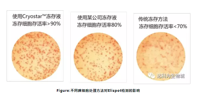 在 ELISPOT 檢測的應用中,往往需要用到凍存的淋巴細胞樣品作為檢測細胞。由于 ELISPOT檢測的是細胞的免疫功能,不僅僅需要保持細胞的存活率,而且還要保證細胞的功能不發(fā)生變化。傳統(tǒng)的細胞凍存方法通常是為了保存細胞株,對細胞存活率的要求不高,更沒考慮保持細胞原有的免疫狀態(tài),所以傳統(tǒng)的細胞凍存方法已經(jīng)不能滿足 ELISPOT 檢測的要求。