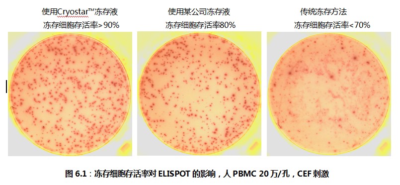 考慮到ELISPOT檢測的特殊性,荷蘭U-CyTech公司經(jīng)過精心的研究與反復(fù)的驗(yàn)證,推出了Cryostar?凍存試劑盒,在凍存液中添加了一系列對細(xì)胞有特殊保護(hù)作用的保護(hù)劑。達(dá)科為公司在接到Cryostar?凍存試劑盒之后,在我們的實(shí)驗(yàn)室以及國內(nèi)數(shù)家客戶的實(shí)驗(yàn)室做了細(xì)胞凍存與復(fù)蘇的實(shí)驗(yàn),并且對復(fù)蘇之后的細(xì)胞做了ELISPOT檢測。結(jié)果表明,淋巴細(xì)胞的存活率超過90%,ELISPOT斑點(diǎn)形成頻率與新鮮細(xì)胞完全相同。參見圖6.1。
