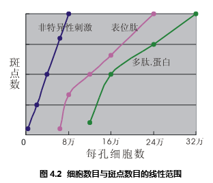 非特異性的刺激物可以直接刺激淋巴細胞,這種刺激不依賴于APC或者其它輔助細胞,是單細胞反應(yīng)行為。所以它對細胞密度沒有要求,在極寬的細胞濃度范圍之內(nèi)——多至40萬/孔,低至5千/孔——斑點數(shù)量和細胞數(shù)量都有簡單的正比例關(guān)系,參見圖4.2。但是考慮到,只有恰當?shù)陌唿c數(shù)目才便于數(shù)據(jù)統(tǒng)計,所以推薦細胞密度為10萬/孔。如果細胞數(shù)目過多,滿孔都會被斑點覆蓋,并且相互重疊。