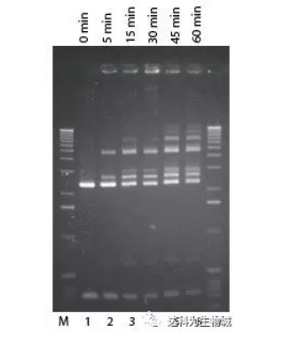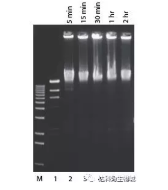 按標準連接反應(yīng)使用2U Fast-Link? ligase進行Lambda Hind III markers連接(泳道2-6). 泳道M, 1-kb ladder;泳道1,無酶對照;泳道2-6, 分別為5 min, 15 min, 30 min, 1 hr, 2 hr連接結(jié)果。